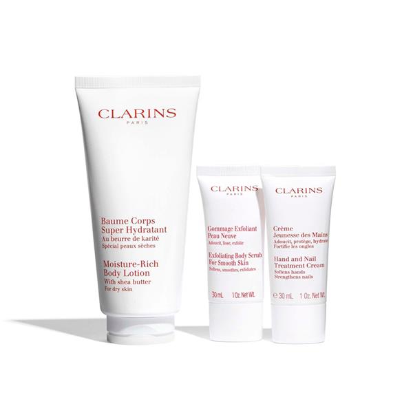 Moisture Rich Body Lotion 200ml, Exfoliating Body Scrub 30ml, Hand & Nail Treatment 30ml in a Clarins pouch. Hydrates, softens, and nourishes skin.