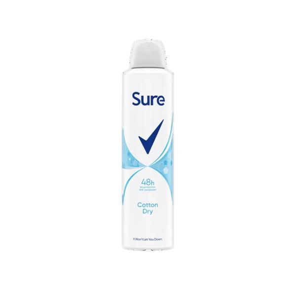 Be confident with Sure Women Cotton Dry Antiperspirant Deodorant. Up your stride with the comfort it brings. Protecting you for up to 48 hours from sweat and body odour, this antiperspirant deodorant spray keeps you comfortable as you move. Feel dry and clean with a scent inspired by fresh cotton sheets.
